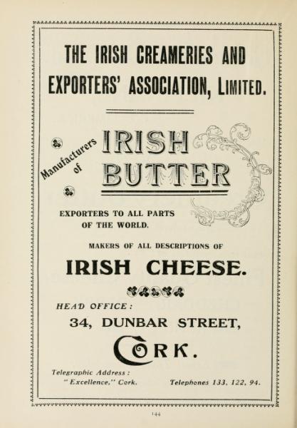 Advertisement for the Irish Creameries and Exporters' Association, Dunbar Street, Cork (1908)