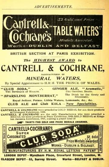 | Advertisement for Cantrell and Cochrane's Table Waters, 'By Special Appontment to H.R.H. Prince of Wales'. Taken from the flyleaf of Alice L. Milligan's The Life of Theobald Wolfe Tone (1798), 'published at the office of Shan Van Vocht', Belfast. | |