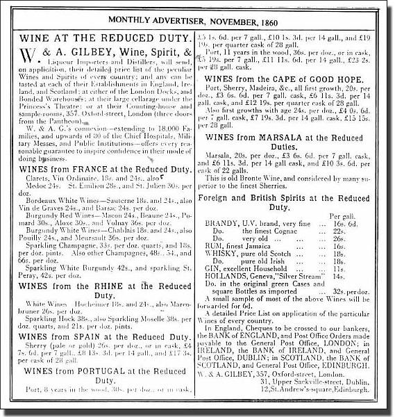 Advertisement for Gilbey's the vintners, London, Dublin and Edinburgh (1860).