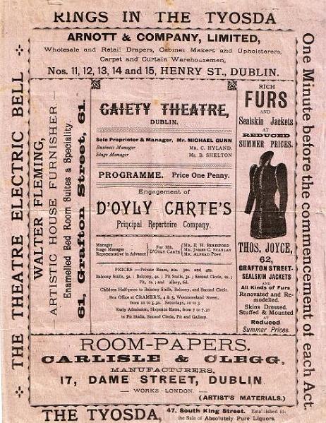 Back cover to programme, Gaiety Theatre, Dublin (1892).