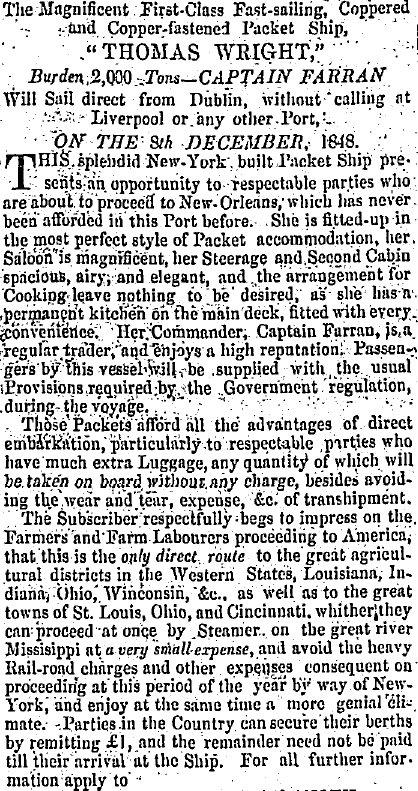 1848. Advertisement for the emigrant ship 'Thomas Wright'.